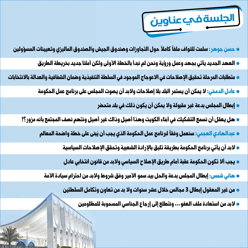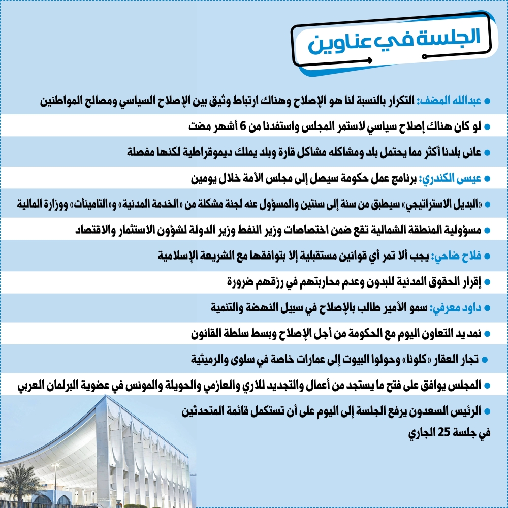 وختمت الجلسة بحديث داود معرفي الذي قال إن سمو الأمير طالب بالإصلاح في سبيل النهضة والتنمية، وشدد على ضرورة التعاون بين السلطتين، ونحن نمد يد التعاون اليوم مع الحكومة من أجل الإصلاح وبسط سلطة القانون وتحقيق تطلعات المواطنين، فضاع كثير من الوقت في تصفية الحسابات، واليوم التشريع يجب أن يكون واقعاً من أجل الوطن والمواطن.