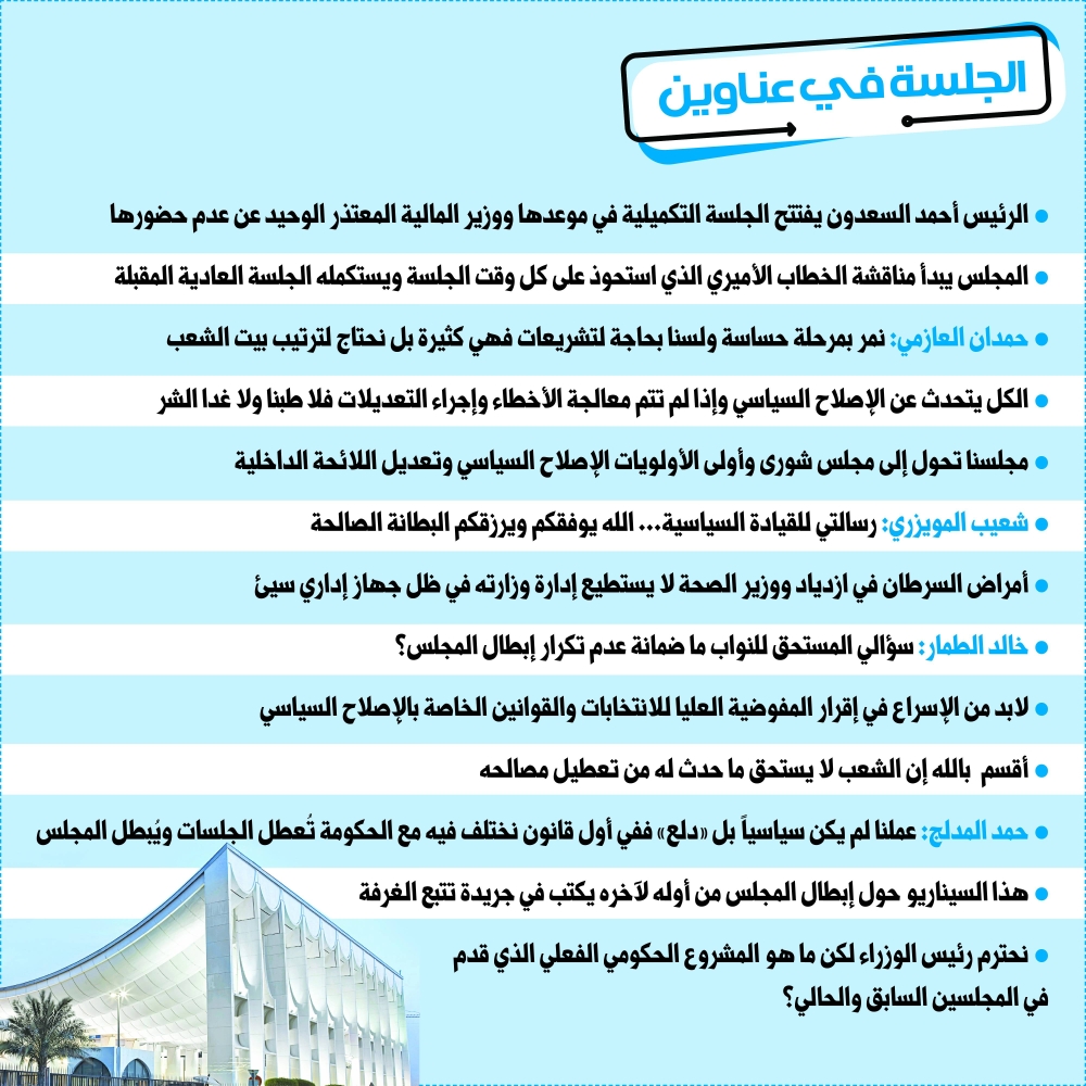 أما عن الجلسة التكميلية التي استحوذ على وقتها مناقشة الخطاب الأميري في افتتاح دور الانعقاد الأول من الفصل التشريعي السابع عشر، فقد طغت المطالبة بتحقيق الإصلاحات السياسية على أحاديث النواب، الذين اعتبروها أولى الأولويات وأن وقتها قد حان، داعين إلى إقرار قوانينها لاسيما إنشاء المفوضية العليا للانتخابات، وتعديل قانون المحكمة الدستورية ومخاصمة القضاء، إضافة إلى استكمال العفو، وإصلاح قانون الجنسية، مع تقديم برنامج عمل حكومي يحاكي التطلعات الشعبية.