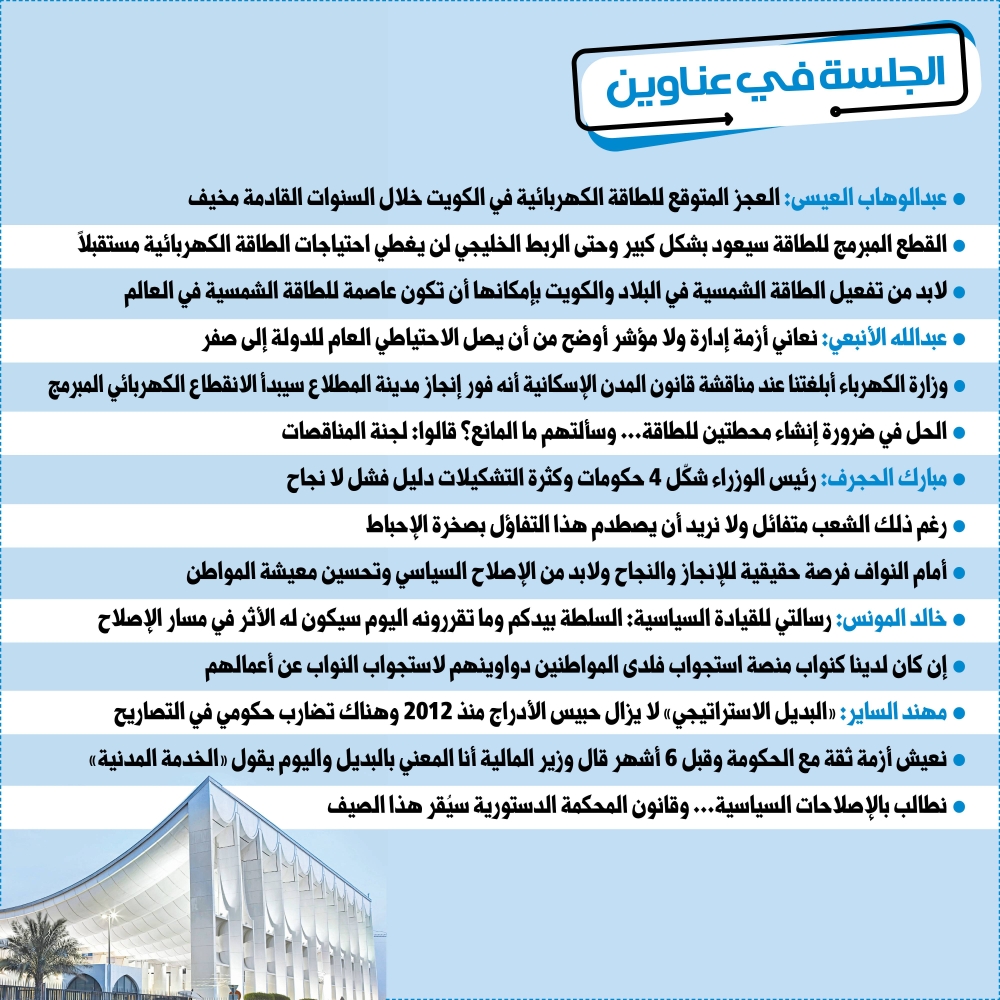 بدوره، قال النائب عبدالوهاب العيسى، إن العجز المتوقع للطاقة الكهربائية في الكويت خلال السنوات القادمة مخيف والقطع المبرمج للطاقة سيعود بشكلٍ كبير، وحتى الربط الخليجي لن يغطي احتياجات الطاقة الكهربائية مستقبلاً وسنصل إلى عجز 1600 ميغاواط خلال خمس سنوات والعام الحالي سيصل إلى أكثر من 600 ميغاواط، وهيئة الشراكة فاشلة ولابد من تفعيل الطاقة الشمسية في البلاد، وبإمكان الكويت أن تكون عاصمة للطاقة الشمسية في العالم هذا المورد الطبيعي المهم المستمر طوال العام ولابد من إدخال هيئة الاستثمار شريكاً في مشاريع الطاقة.