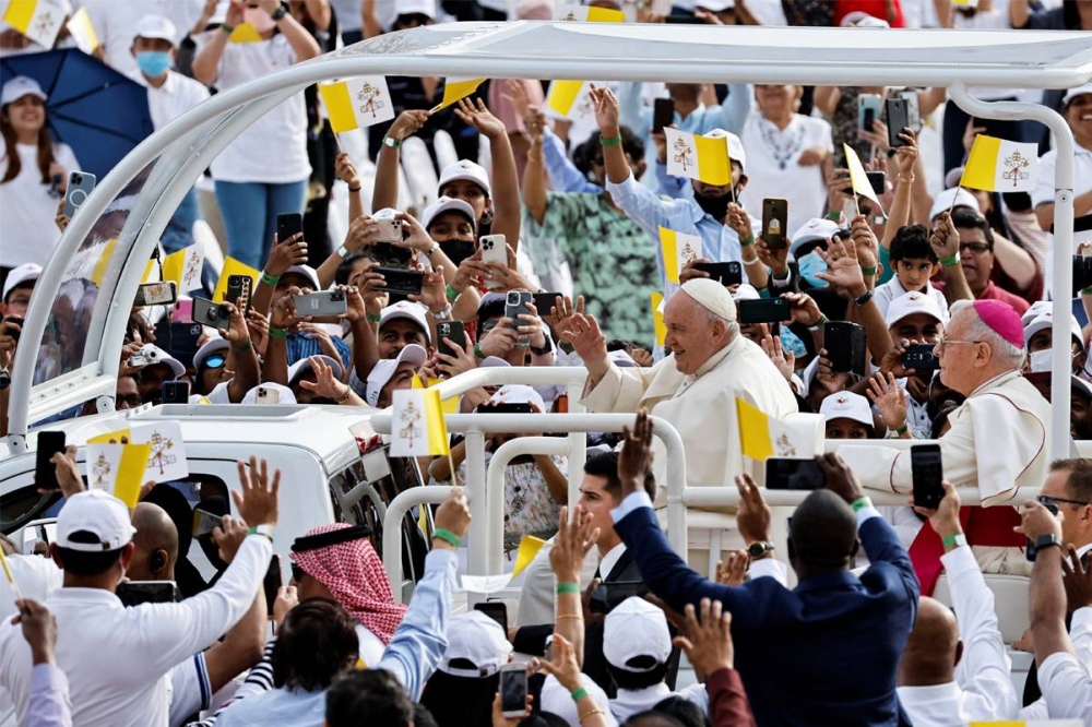 بحضور أحد أبناء الملك حمد بن عيسى آل خليفة وعدد من الوزراء في البحرين، أقام البابا فرنسيس اليوم قداسا حضره آلاف المسيحيين في البحرين، مما أدخل السرور على أعضاء الجالية الكاثوليكية الأجنبية الصغيرة من جميع أنحاء الخليج. وبلغ عدد الحشد نحو 30 ألفا امتلأ بهم استاد البحرين الوطني، وفي عظته، بدا أن البابا فرنسيس يمتدح سياسة البحرين المنفتحة تجاه غير المسلمين، وقال: «هذه الأرض تحديدا هي صورة حية للتعايش مع التنوع، وهي في الواقع صورة لعالمنا الذي يتسم بشكل متزايد بالهجرة المستمرة للشعوب والتعددية في الأفكار والعادات والتقاليد».