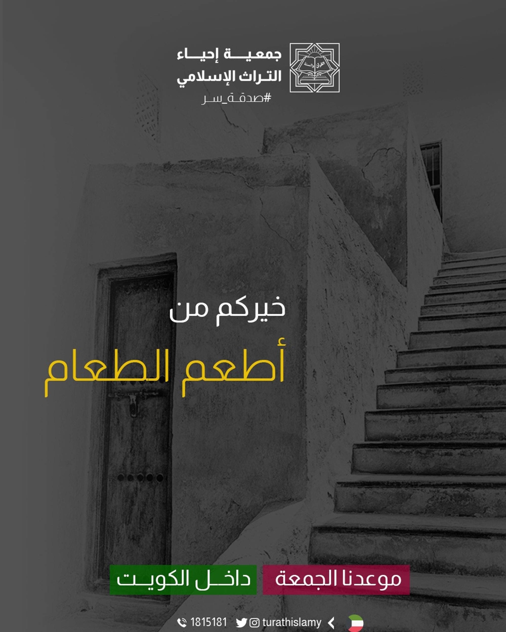 تطرح جمعية إحياء التراث الإسلامي، غدا، مشروع «خيركم من أطعم الطعام»، والذي يهدف الى مساعدة الأسر الفقيرة والمحتاجة داخل الكويت من خلال تقديم المواد الغذائية الأساسية لهم.