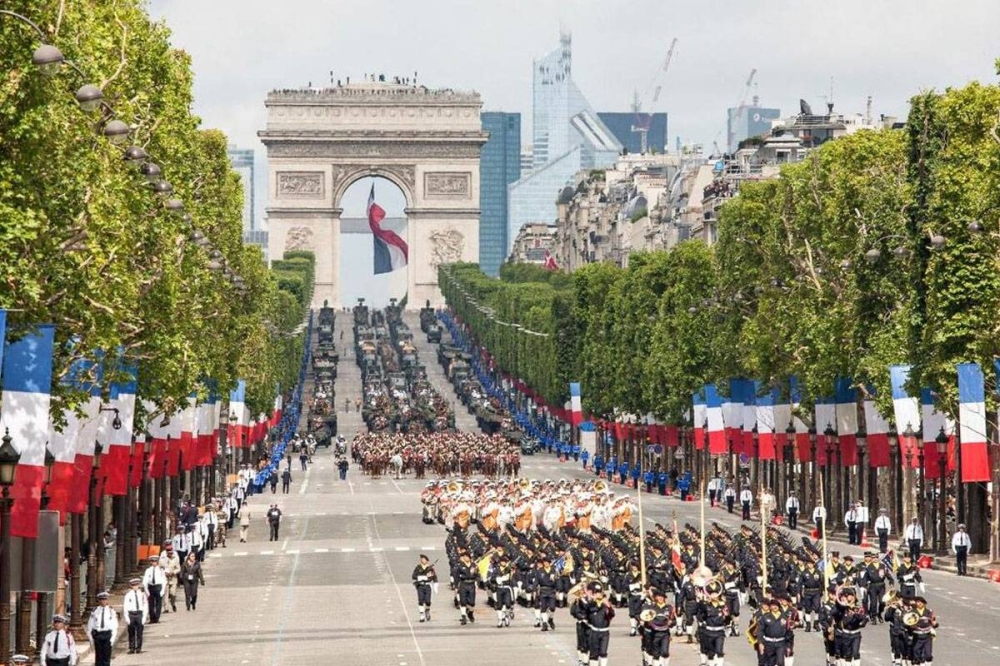 بعد عرض موسيقي شاركت فيه 12 دولة ساعدت فرنسا خلال عقد أثناء تدخلها العسكري في منطقة الساحل، نفذت تسع طائرات ألفاجت عرضاً جوياً في سماء باريس رسمت خلاله العلم الفرنسي بالأزرق والأبيض والأحمر، ثم افتتح العرض 240 عنصراً من القوات المسلحة الهندية وضع بعضهم عمامات على رؤوسهم.