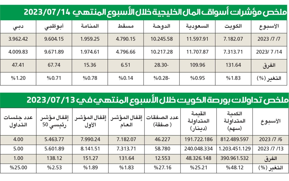 استعادت مؤشرات بورصة الكويت الرئيسية خسائر النصف الأول كاملة تقريبا، خصوصا على مستوى مؤشر السوق الأول، وسجلت نموا متواصلا للأسبوع السادس على التوالي، وربح مؤشر السوق العام نسبة 1.83 بالمئة، أي 131.64 نقطة، ليقفل على مستوى 7313.71 نقطة، ليعود الى نقطة الانطلاق التي بدأ بها العام الحالي متعادلا، بينما سجل مؤشر السوق الأول نموا أكبر بلغ 1.89 بالمئة، أي 151.27 نقطة، ليقفل على مستوى 8141.51 نقطة، محققا ارتفاعا بنسبة محدودا لعام 2023 هو عُشر نقطة مئوية، وسجل مؤشر رئيسي 50 نموا أكبر بنسبة 2.53 بالمئة، أي 183.12 نقطة، ليقفل على مستوى 5601.89 نقطة، مقلصا خسائر هذا العام الى 2.9 بالمئة.