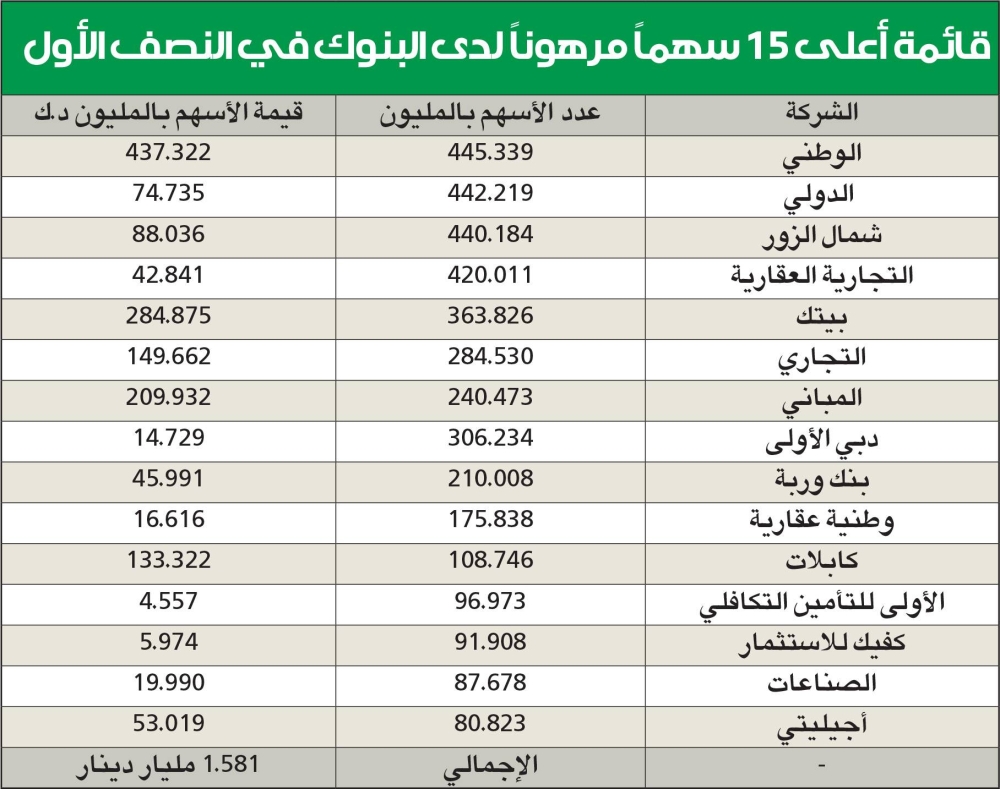 قائمة أعلى 15 سهماً مرهوناً لدى البنوك في النصف الأولالشركة عدد الأسهم بالمليون قيمة الأسهم بالمليون د.ك الوطني 445.339437.322 الدولي 442.21974.735شمال الزور440.18488.036التجارية العقارية 420.01142.841بيتك 363.826284.875التجاري 284.530149.662المباني 240.473209.932دبي الأولى 306.23414.729بنك وربة 210.00845.991وطنية عقارية 175.83816.616كابلات 108.746133.322الأولى للتأمين التكافلي 96.9734.557كفيك للاستثمار 91.9085.974الصناعات 87.67819.990أجيليتي 80.82353.019-الإجمالي1.581 مليار دينار