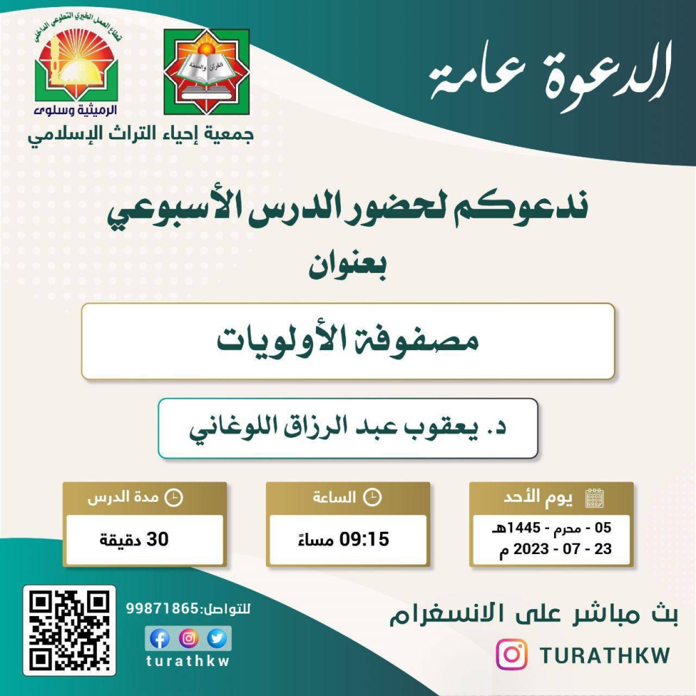 تنظم جمعية إحياء التراث الإسلامي درساً أسبوعياً بعنوان: «توجيهات أسرية وزوجية» يلقيه الشيخ محمد الهاجري، مساء اليوم، في ديوان صالح العجمي بالنسيم، ويشرف على هذا النشاط لجنة الكلمة الطيبة في منطقة الجهراء التابعة للجمعية. وأقامت الجمعية، أمس، درساً أسبوعياً بعنوان: «مصفوفة الأولويات»، ألقاه الشيخ د. يعقوب اللوغاني، بإشراف فرع الجمعية في الرميثية وسلوى.