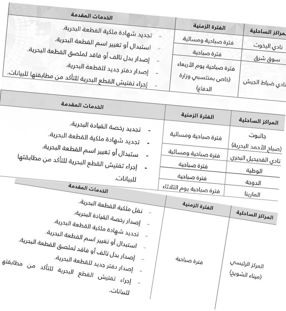 من جانب آخر، وتماشياً مع قرار النائب الأول، استحدثت الإدارة العامة لخفر السواحل مراكز لاستقبال معاملات المواطنين والمقيمين ذات الصلة للخدمات التي تقدمها إدارة النقل البحري في الفترة الصباحية من الساعة 8:00 صباحاً حتى الساعة 01:30 ظهراً والفترة المسائية من الساعة 03:00 عصراً حتى الساعة 07:00 مساء خلال أيام العمل الرسمية.
