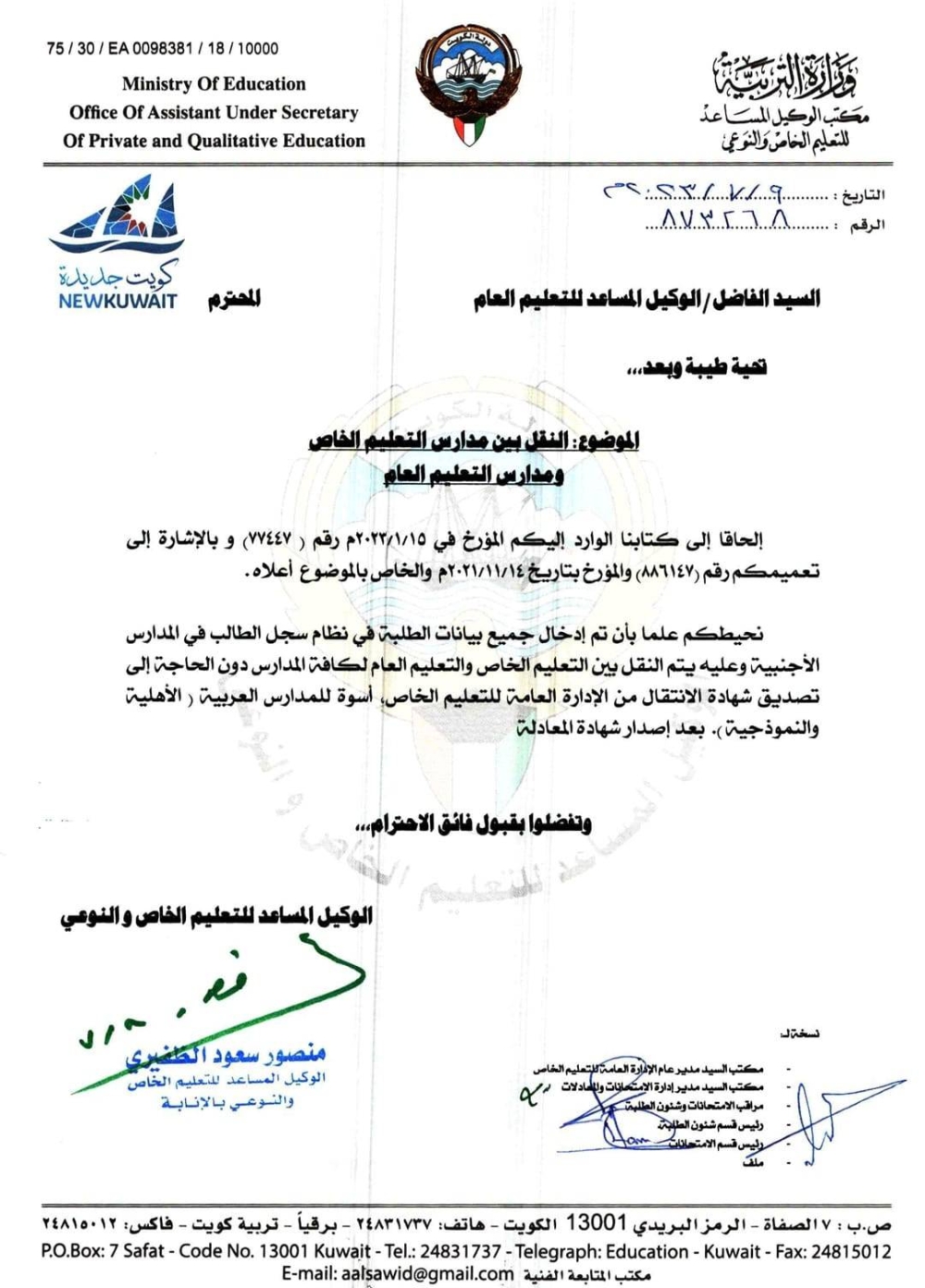 ولفت الظفيري، في كتاب وجهه إلى وكيل التعليم العام وحصلت «الجريدة» على نسخة منه، إلى إمكانية إجراء النقل بين التعليم الخاص والتعليم العام لجميع المدارس دون الحاجة إلى تصديق شهادات الانتقال من التعليم الخاص كما كان معمولا به في السابق، أسوة بالمدارس العربية الخاصة وذلك بعد اصدار شهادة المعادلة.