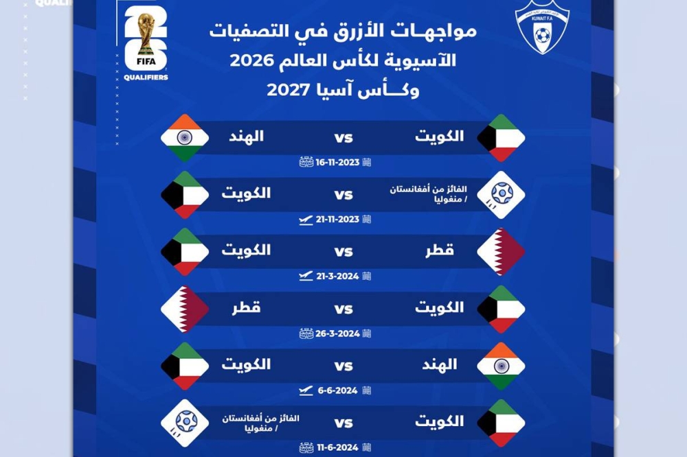يستهل منتخب الكويت منافساته في الدور الأول من التصفيات الآسيوية المزدوجة لكأسي العالم 2026 وآسيا 2027 باستضافة المنتخب الهندي في 16 نوفمبر المقبل، قبل أن يواجه الفائز من منتخبي أفغانستان ومنغوليا على أرض أي منهما في 21 منه، ثم يحل الأزرق ضيفاً على شقيقه القطري في 21 مارس، ثم يلتقي المنتخبات مجدداً في الكويت في 26 من الشهر ذاته، على أن يواجه نظيره الهندي في 6 يونيو، يليه الفائز من أفغانستان ومنغوليا في 11 منه.