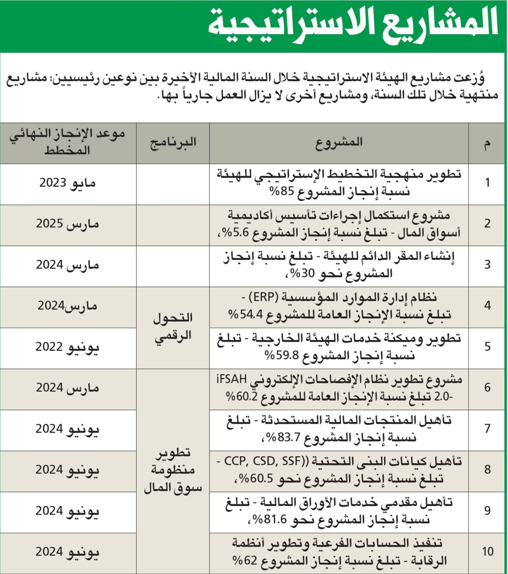 استراتيجياً، يتزامن ختام السنة المالية موضوع التقرير مع موعد انتهاء ثاني استراتيجيات الهيئة، وإطلاق ثالث استراتيجياتها مع مطلع السنة المالية التالية. تلك الاستراتيجية بركائزها الثلاثة (تنمية سوق المال، التعاون والتواصل، التمكين المؤسسي) وأهدافها التسعة تؤسس - في اعتقادي - لمرحلة نوعية قولاً وفعلاً في مسار أنشطة الأوراق المالية المحلية، كما أنها في الوقت ذاته تمثل تحدياتٍ جسيمة نظراً لما تتضمنه من مبادراتٍ واجبة التنفيذ يبلغ تعدادها ستاً وعشرين مبادرة رئيسية تتوزع إلى مئة واثنتي عشرة مبادرةٍ فرعيةٍ بالتمام والكمال تمثل بمجملها خارطة طريقٍ للمرحلة المقبلة.