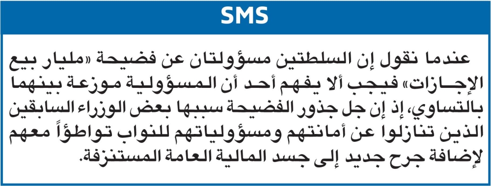 بعدما كشفت فضيحة «مليار الإجازات» مقدار التخبط والفوضى وقصر النظر الذي شاب اتخاذ قرار بيع الإجازات، وبعدما أصبح التسبب فيها اتهاماً تتبرأ منه السلطتان وتلقي كلتاهما بمسؤوليته على الأخرى، بات على الحكومة إدراك أن الرجوع إلى الحق خير من التمادي في الباطل، وأن تعمد إلى التحلي بالشجاعة من أجل وقف هذا النزيف العبثي غير المبرر في هدر المال العام، والتصارع المحموم على تصفية مقدرات البلد عبر ما يسمى بـ «الاستبدال».