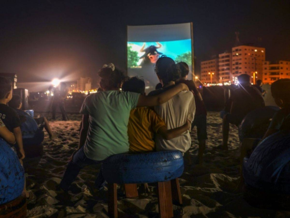على شاطئ بحر غزة، يجلس عشرات الأشخاص على مقاعد خشبية مستحدثة قبالة شاشة عرض كبيرة يتابعون بانبهار فيلما سينمائيا للأطفال، في حدث نادر في القطاع الساحلي المحروم من دور السينما منذ سنوات طويلة.