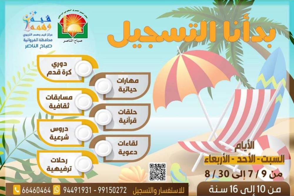 وضعت جمعية إحياء التراث الإسلامي من خلال اللجان والمراكز الشبابية التابعة لها برامج وأنشطة صيفية ثقافية خاصة بالشباب والصغار، ومن ذلك تنظيم نادي صيفي يشرف عليه مركز «قيم وهمم» التربوي في منطقة صباح الناصر التابعة للجمعية للأعمار من 10 سنوات حتى 16 سنة، والدراسة فيه خلال أيام السبت والأحد والأربعاء من كل أسبوع، وتستمر حتى نهاية أغسطس الجاري. وتتضمن أنشطة المركز عدة برامج ثقافية وعلمية متنوعة تسعى لغرس وتعزيز القيم في نفوس الناشئة منها: حفظ القرآن الكريم والدورات والدروس والمحاضرات الشرعية، بالإضافة للبرامج الترفيهية والرياضية مثل: كرة القدم والسباحة، والرحلات والمسابقات الثقافية.