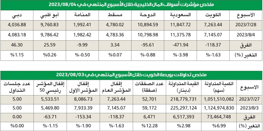 تراجعت مؤشرات بورصة الكويت للأسبوع الثاني على التوالي وخسر مؤشر بورصة الكويت العام نسبة 1.63 في المئة أي 118.37 نقطة ليقفل على مستوى 7145.07 نقطة ليبقى خاسراً بنسبة 1.4 في المئة هذا العام، وخسر مؤشر السوق الأول نسبة أكبر بلغت 1.9 في المئة أي 153.34 نقطة ليكسر مستوى 8 آلاف نقطة ويقفل على مستوى 7933.39 نقطة ويخسر أكثر مقارنة مع افتتاح هذا العام وبنسبة 1.7 في المئة، كما تراجع مؤشر السوق رئيسي 50 بنسبة 1.15 في المئة أي 63.71 نقطة ليقفل على مستوى 5469.80 نقطة موسعاً خسارته إلى 3 في المئة لعام 2023.