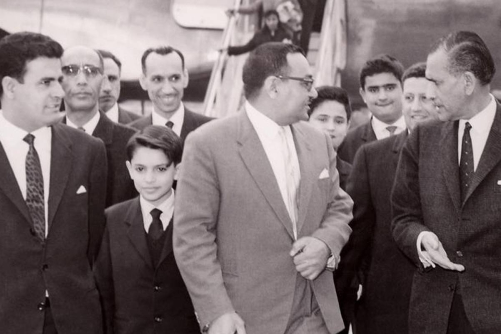 عبدالعزيز الصقر عند وصوله إلى مطار بيروت وإلى جانبه ابن شقيقه محمد جاسم الصقر وسفير الكويت لدى لبنان محمد أحمد الغانم والقائم بالأعمال مهلهل المضف في الستينيات