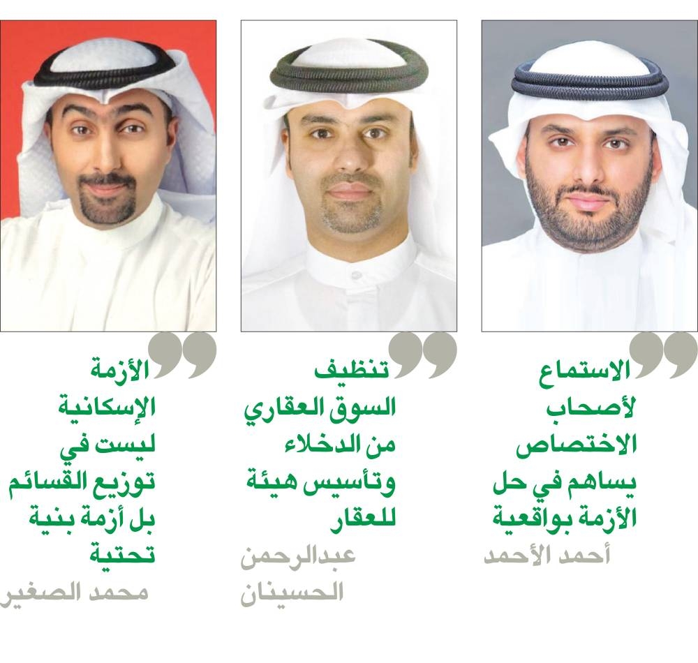 وقال العقاريون، في تصريحات متفرقة، إن تشكيلة لجنة العقار والإسكان في مجلس الأمة بدور الانعقاد الحالي تعكس الرغبة في تنفيذ خطوات إصلاح حقيقية في قطاع الرعاية السكنية والقطاع العقاري الذي يعاني الكثير من التحديات، لافتين إلى أن هناك آمالاً كبيرة على اللجنة التي يغلب على أعضائها الطابع الشبابي، بوصفهم الأقرب للتعرف على أزمات الشباب في الحصول على سكن، وكذلك العمل على ضبط إيقاع السوق العقاري.