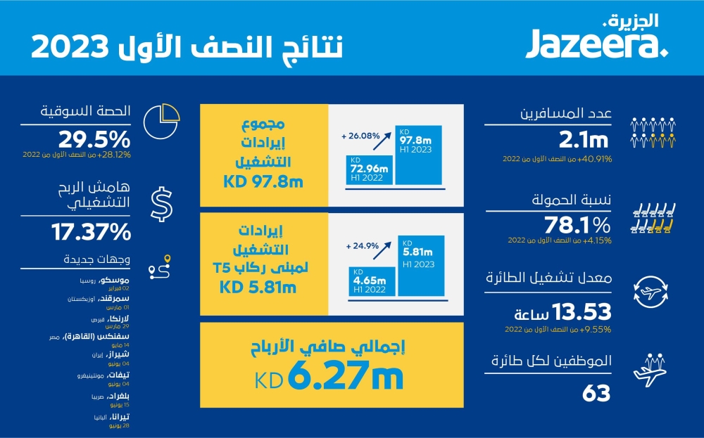 ومعلقاً على هذه النتائج، قال رئيس مجلس إدارة «طيران الجزيرة»، مروان بودي: «سعداء بإعلان هذه النتائج الإيجابية للنصف الأول من 2023، وتبقى نظرتنا إيجابية لأداء الشركة المستقبلي، إذ إن الطلب على السفر قوي، ويترجم في الزيادة في حركة الركاب، كذلك في المعدلات الثابتة لإشغال المقاعد، إضافة إلى إطلاق الشركة العديد من الوجهات الجديدة التي تتمتع بالطلب العالي، واستعدادها لإطلاق المزيد في النصف الأخير من العام. مع هذا التوسع، نواصل الحرص على تعزيز الأداء التشغيلي والمالي، من خلال نوعية المنتجات والخدمات والمبادرات المختلفة التي من شأنها الحفاظ على حقوق المساهمين وشركائنا وعملائنا».
