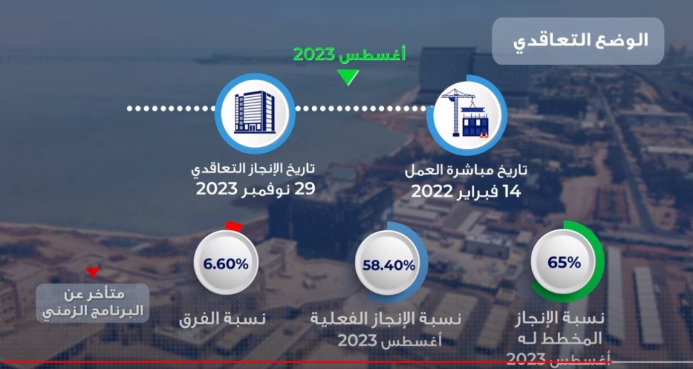 واستنادا إلى التقرير، فإن العمل بالمشروع بدأ في فبراير 2022، على أن ينجز المشروع (تعاقدياً) في نوفمبر المقبل، علماً بأن نسبة الإنجاز الفعلية للمشروع اليوم تبلغ 58.4 في المئة، بتأخير 6.6 في المئة عن البرنامج الزمني.