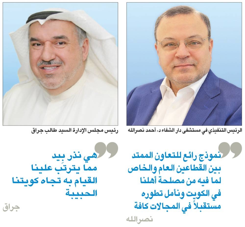 وأكد نصرالله استمرار الدور المجتمعي للمستشفى في المجالات المجتمعية كافة التي يمكن من خلالها تحقيق منظومة صحية مستدامة، قائلاً إن مستشفى دار الشفاء هو مؤسسة طبية صحية اجتماعية تسعى لتحقيق خير الكويت في كل مجال يمكن أن تؤديه، موضحاً أنه مستمر في تقديم المزيد من المبادرات الاجتماعية في قادم الأيام.