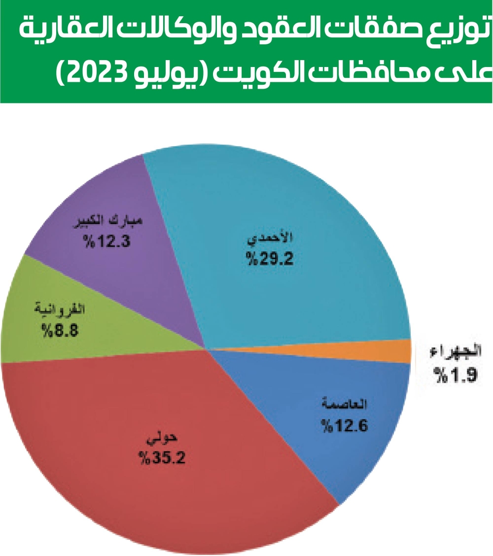 وحسب التقرير الأسبوعي الصادر عن شركة الشال للاستشارات، توزعت تداولات يوليو 2023 ما بين نحو 193.7 مليون دينار عقوداً، ونحو 1.7 مليون وكالات. وبلغ عدد الصفقات العقارية لهذا الشهر 318 صفقة، توزعت ما بين 315 عقداً و3 وكالات. وحصدت محافظة حولي أعلى عدد من الصفقات بـ 112 صفقة وممثلة بنحو 35.2% من إجمالي عدد الصفقات العقارية، تليها محافظة الأحمدي بـ 93 صفقة وتمثل نحو 29.2%، في حين حظيت محافظة الجهراء بأدنى عدد من الصفقات بـ 6 صفقات ممثلة بنحو 1.9%.