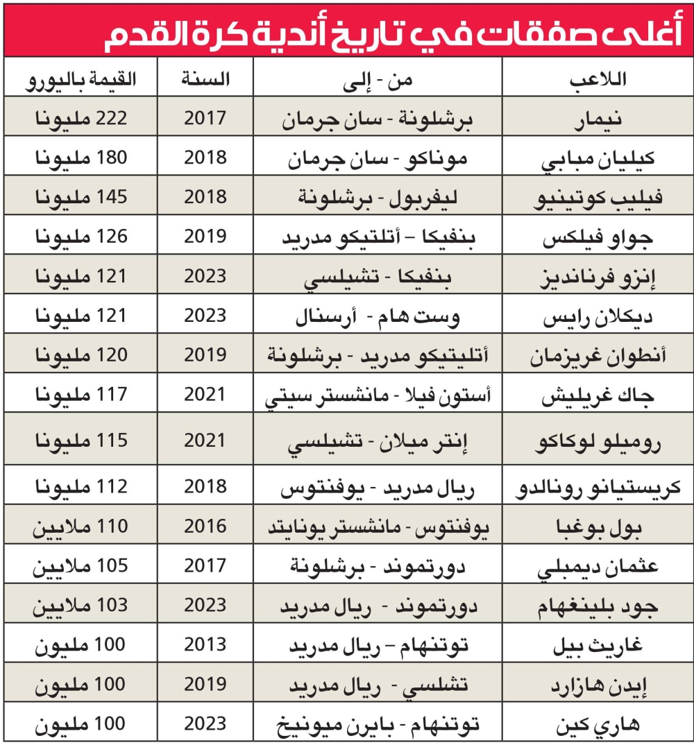 لا تزال صفقة انتقال المهاجم البرازيلي نيمار إلى باريس سان جرمان مقابل 222 مليون يورو في 2017 هي الأعلى على الإطلاق من بين صفقات أندية كرة القدم عبر التاريخ.