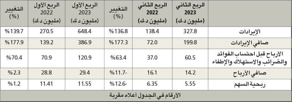 أما للأشهر الستة الأولى من العام، فبلغ صافي أرباح الشركة 29.4 مليون دينار، بنمو نسبته 2.3 في المئة، ونمت الأرباح قبل احتساب الفوائد والضرائب والاستهلاك والإطفاء 70.4 في المئة، والإيرادات بنسبة 139.7 في المئة عن نفس الفترة من العام السابق.