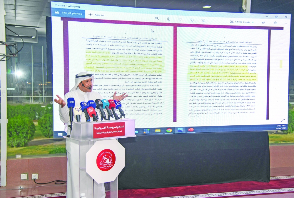 وأضاف أن هذا الحكم ناقشه مسؤولو الهيئة، وتم إرساله إلى «الفتوى والتشريع» بواسطة المدير العام الأسبق الشيخ أحمد المنصور، والتي أكدت في ردها أنه لا يمس قرار الإشهار أو صحة إجراءاته، كما قام وزير الإعلام عبدالرحمن المطيري بتشكيل لجنة تقصي حقائق من سبع جهات حكومية، واتفق الجميع على صحة إجراءات إشهار نادي فروسية الفروانية، وان حكم التمييز الصادر عام 2017 لا يمسها بأية شائبة.