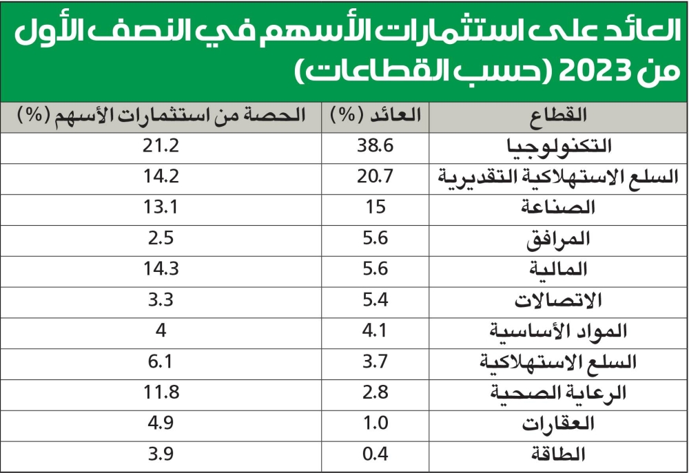 وحققت استثمارات الأسهم عوائد 13.66% في النصف الأول من العام الحالي، مقسمة إلى 7.44% في الربع الأول و5.79% في الربع الثاني.