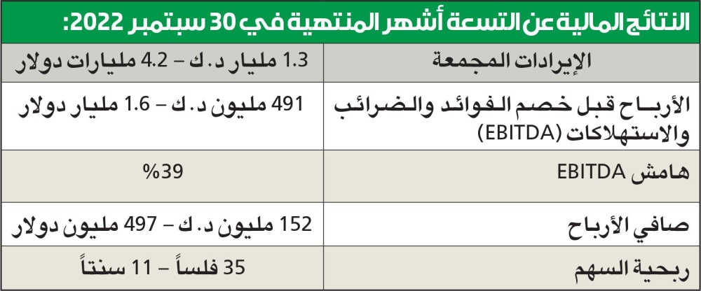 وسجلت النتائج المالية الفصلية لعمليات المجموعة نمواً صحياً عن فترة الربع الثالث، إذ سجلت الأرباح الصافية نمواً بنسبة 10% لتصل إلى 54 مليون دينار (176 مليون دولار)، بربحية 13 فلساً للسهم الواحد، ونمت الأرباح قبل خصم الفوائد والضرائب والاستهلاكات (EBITDA) بنسبة 2% لتصل إلى 171 مليون دينار (555 مليون دولار)، وقفزت الإيرادات المجمعة الفصلية بنسبة 15% لتصل إلى نحو 441 مليون دينار (1.4 مليار دولار).