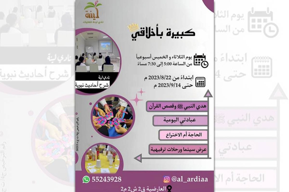 وأشارت الجمعية إلى تنظيم دورة خاصة للفتيات يشرف عليها نادي لينة للفتيات في منطقة العارضية بعنوان «كبيرة بأخلاقي»، موضحة أن الدراسة فيها الثلاثاء والخميس من كل أسبوع، وتستمر حتى 14 الجاري.