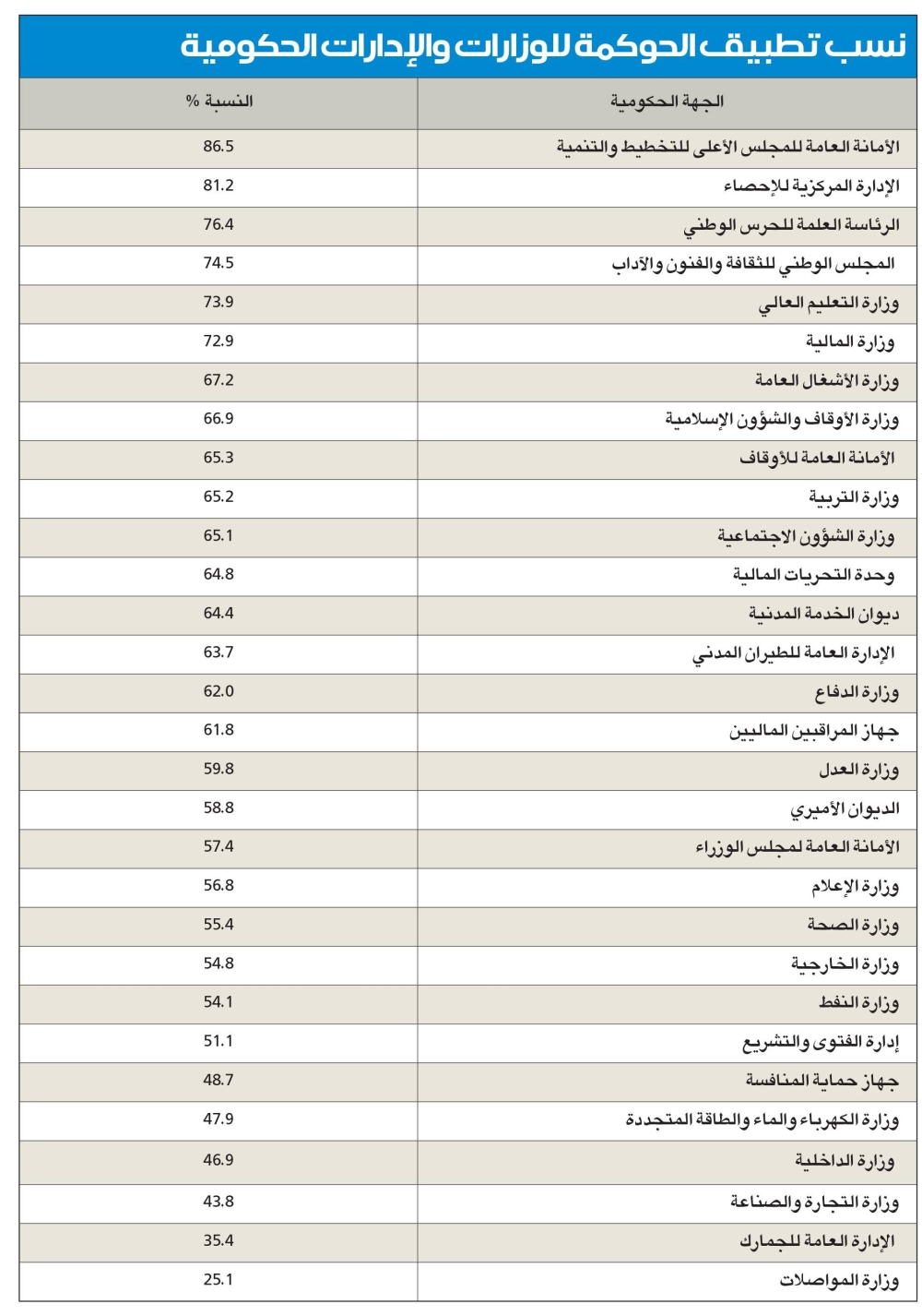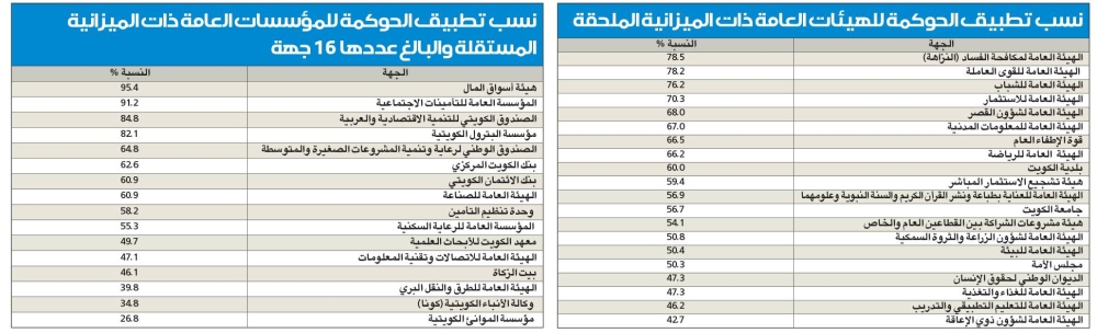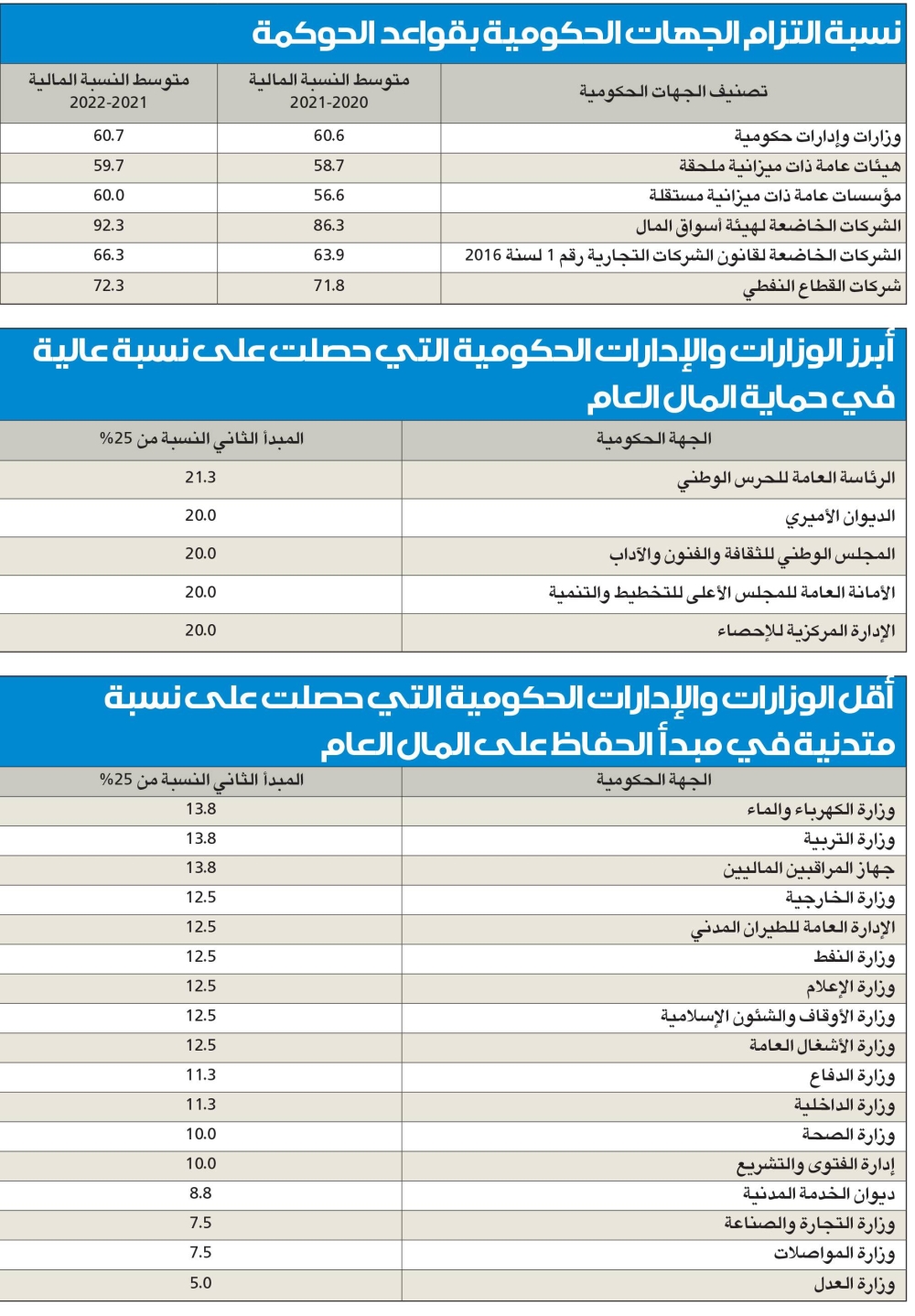 أكد ديوان المحاسبة، في تقريره حول حوكمة القطاع العام والشركات لعام 2021/2022، وجود تحسّن في مجمل مبادئ الحوكمة على مستوى جميع الجهات المشمولة بالرقابة، والتي بلغت نسبتها في الوزارات والإدارات الحكومية 60.7 بالمئة، وفي مؤسسات قائمة ذات ميزانية مستقلة 60 بالمئة، والتي حلّت فيها هيئة أسوق المال في المركز الأول بنسبة التزام بتطبيق قواعد الحوكمة بلغت 95.4 بالمئة.