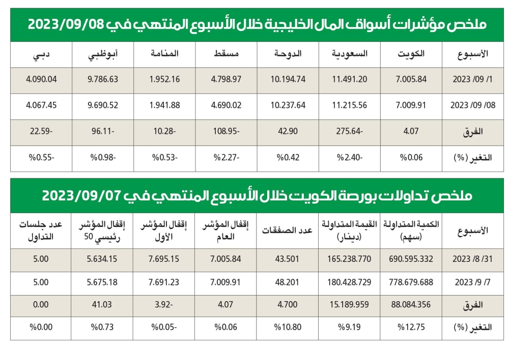 تراجعت معظم مؤشرات الأسواق المالية بدول مجلس التعاون الخليجي خلال تعاملات الأسبوع الماضي، وجاءت محصلتها الأسبوعية بخسارة 5 مؤشرات وارتفاع مؤشرين فقط، وسجّل مؤشر السوق السعودي أكبر خسارة بنسبة كبيرة بلغت 2.4 بالمئة، أي 275.64 نقطة، ليقفل على مستوى 11215.56 نقطة، مواصلا التراجع، وخفض مكاسبه لهذا العام الى نسبة 7 بالمئة فقط، بالرغم من ارتفاع أسعار النفط واستقرارها حول مستوى 90 دولارا للبرميل، وهي أعلى مستوياته خلال 4 أشهر، وحلّ ثانيا من حيث الخسائر مؤشر سوق عمان بخسارة نسبة 2.27 بالمئة، أي 108.95 نقاط، ليقفل على مستوى 4690.02 نقطة، لتزيد خسارته الى نسبة 2.8 بالمئة مع بداية الشهر الأخير من الربع الثالث، كما تراجع مؤشر سوق أبوظبي بنسبة قريبة من 1 بالمئة كانت 0.98 بالمئة، والتي تعادل 96.11 نقطة، ليقفل على مستوى 9690.52 نقطة، محققا أكبر خسارة بين مؤشرات الأسواق المالية الخليجية لما مضى من هذا العام، وبنسبة بلغت 6 بالمئة.