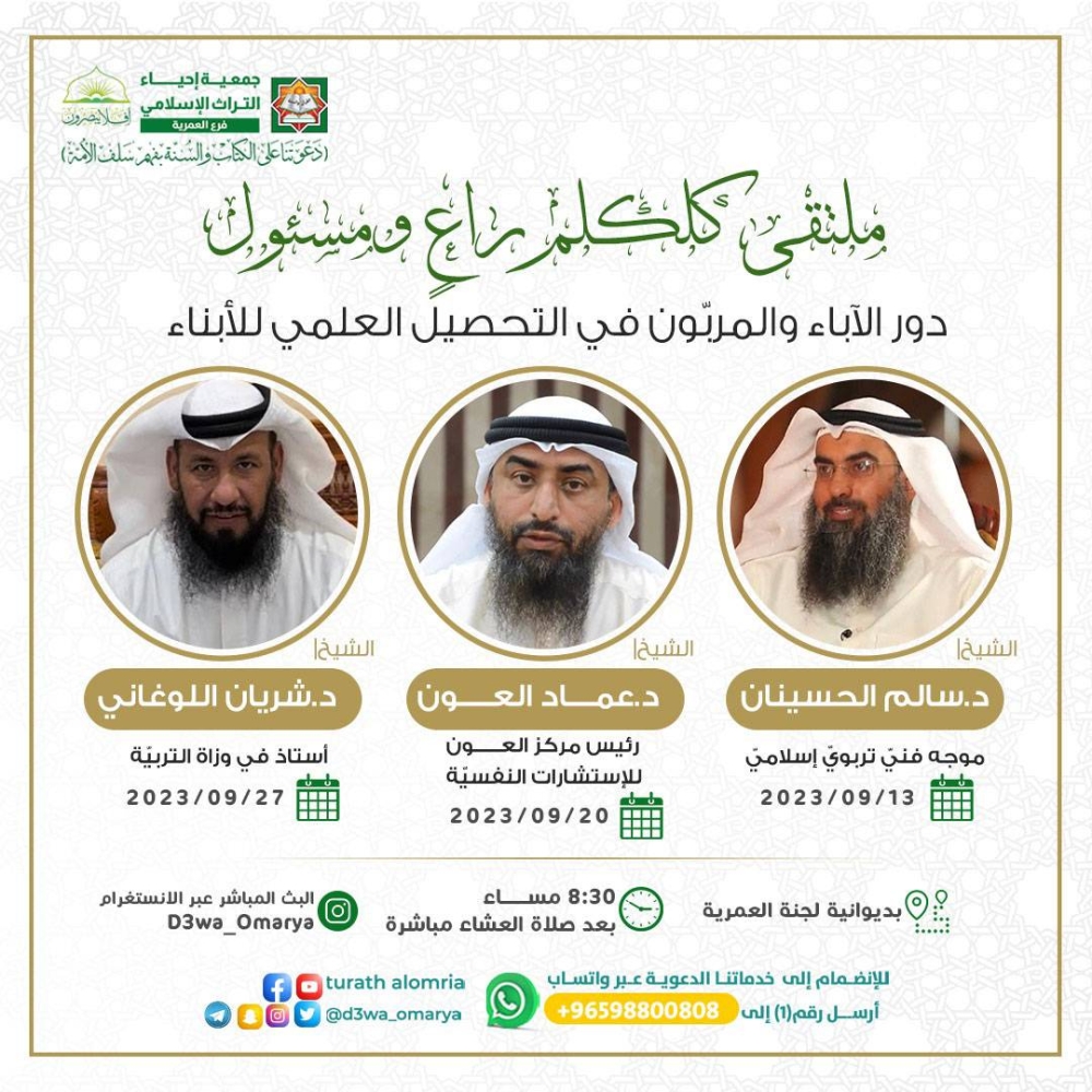 أطلقت جمعية إحياء التراث الإسلامي، ملتقى «كلكم راعٍ ومسؤول»، تزامناً مع انطلاق العام الدراسي الجديد، لبيان أهمية دور الآباء والمربين في التحصيل العلمي للأبناء.