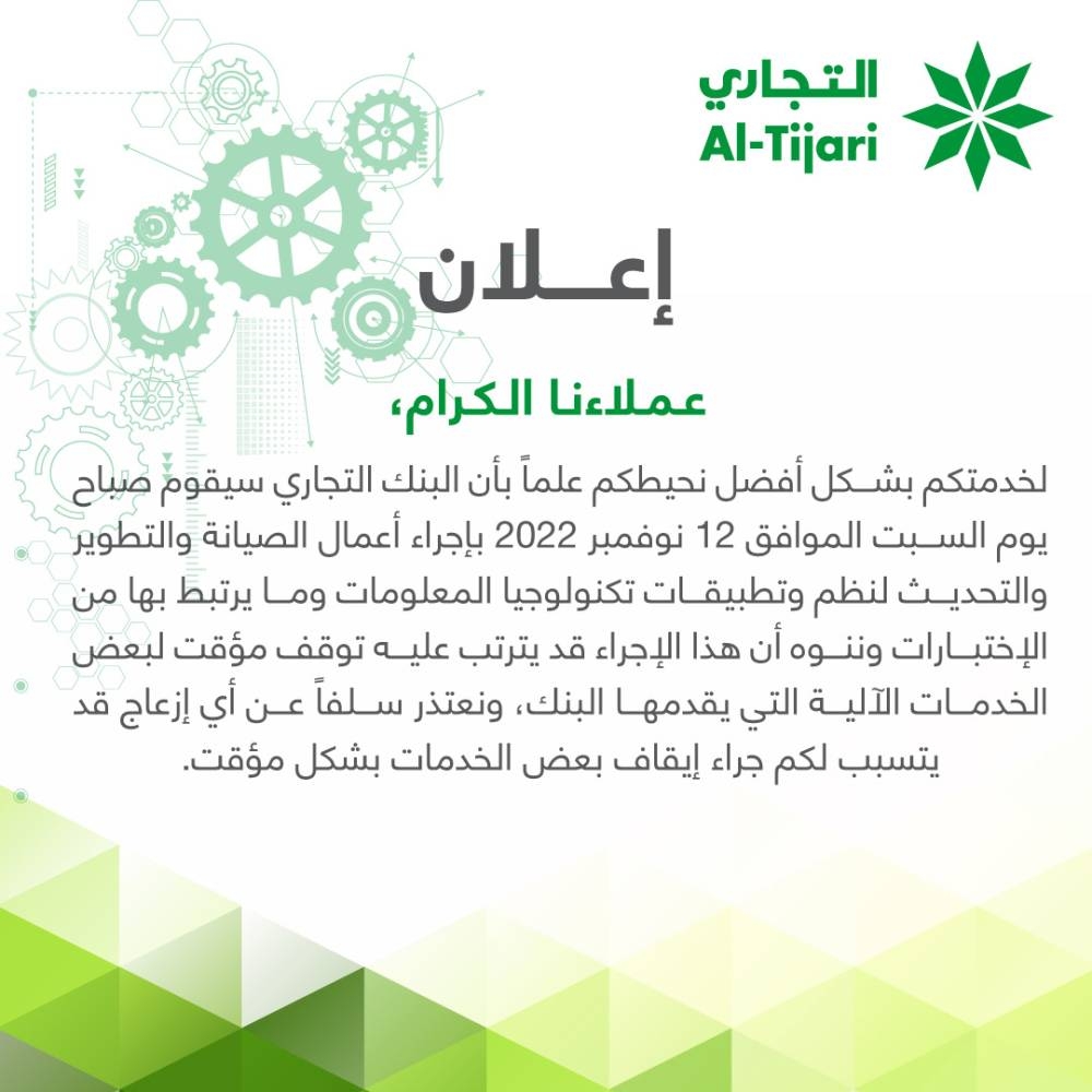 ونحن في «التجاري» إذ نعتذر سلفاً من عملائنا عن أي إزعاج قد يتسبب لهم جراء إيقاف بعض الخدمات التي تتطلبها الاختبارات المنوه عنها، فإننا نتوجه إليهم بخالص التقدير على تفهمهم لمتطلبات تطوير نظم تكنولوجيا المعلومات في البنك، والتي تصب في النهاية في مصلحة العميل، وتساعد البنك على تقديم أفضل الخدمات المصرفية الرقمية المتطورة للعملاء في كل الأوقات.