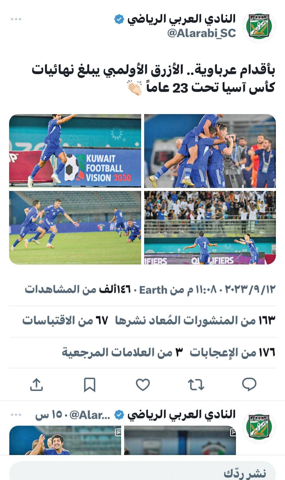 خرجت الصفحة الرسمية للنادي العربي على منصة التواصل الاجتماعي «X» عن المألوف بعد أن وضعت صورة فوز المنتخب الأولمبي تحت تعليق «بأقدام عرباوية... الأزرق الأولمبي يبلغ نهائيات كأس آسيا تحت 23 عاماً».