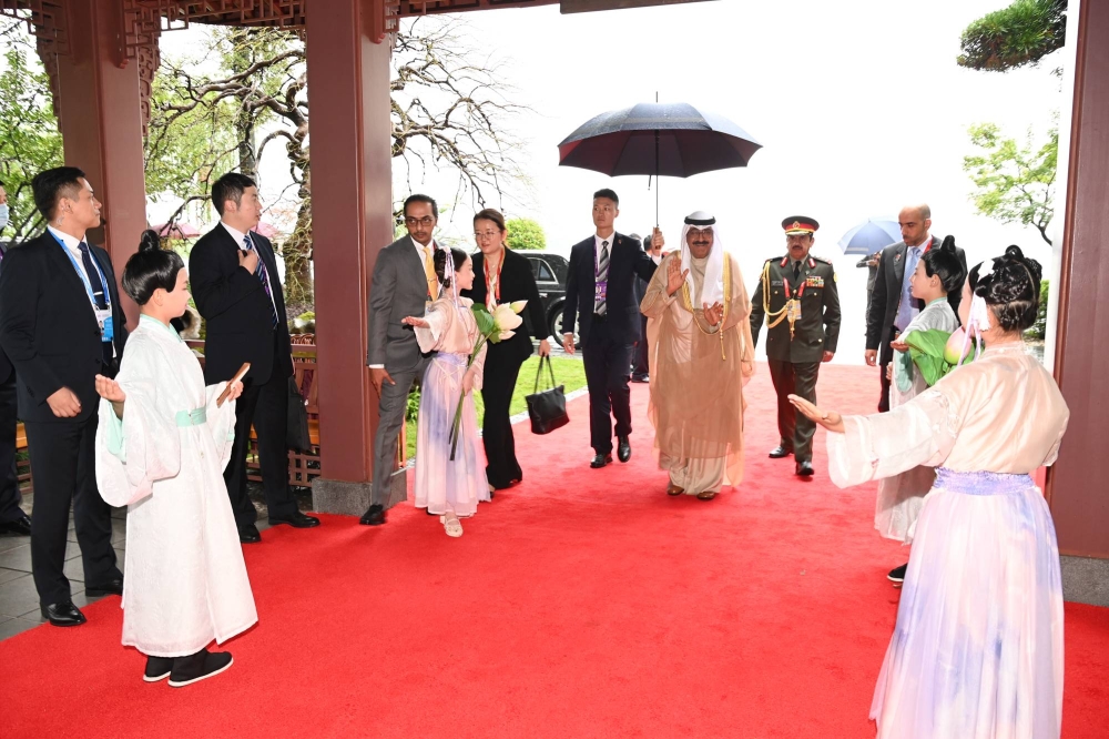 حضر سمو ولي العهد الشيخ مشعل الأحمد ظهر اليوم مأدبة الغداء المقامة من قبل الرئيس شي جين بينغ رئيس جمهورية الصين على شرف أصحاب الجلالة والفخامة والمعالي المدعوين لحضور حفل الافتتاح للدورة الـ19 للألعاب الأولمبية الآسيوية والمنعقدة في مدينة هانغتشو الصينية.