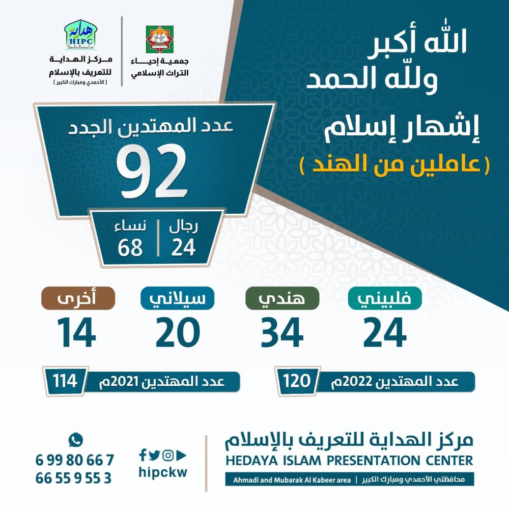 أعلنت جمعية إحياء التراث الإسلامي، إشهار إسلام 92 مهتدياً في محافظتي الأحمدي ومبارك الكبير فقط لهذا العام.