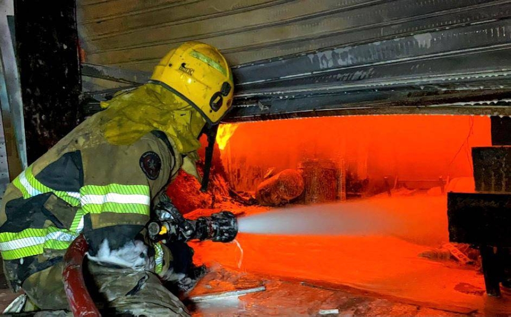 إصابة رجلي إطفاء في حريق محلات أخشاب بالشويخ