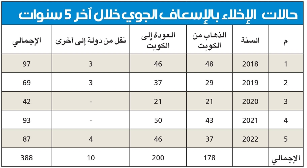 وكانت وزارة الصحة قد كشفت في ردها على الساير أن خدمة الإسعاف الجوي والإخلاء الطبي نقلت 388 حالة خلال السنوات الخمس الماضية، مشيرة إلى أن قيمة الميزانية المرصودة للشركة المتعاقد معها لتقديم تلك الخدمة خلال السنة المالية 2022/2023 تبلغ 5.380.000 ملايين دينار، بينما قيمة العقد في 2021/2022/ بلغت 5.681.000 ملايين دينار وفي 2020/2021 بلغت 3.996.300 ملايين دينار، أما في 2019/2020 بلغت 4 ملايين دينار، مبينة أن قيمة العقد في 2018/2019 كانت 4.710.000 ملايين دينار.