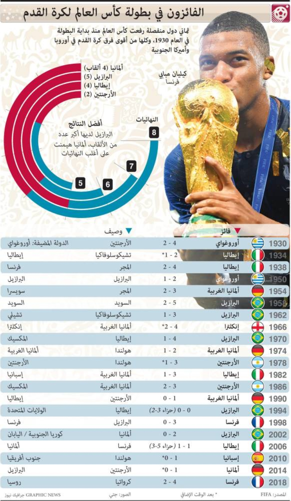 ووحدها البرازيل تواجدت في جميع النسخ الـ21 السابقة، وستخوض في قطر مشاركتها الثانية والعشرين، فيما خاضت ألمانيا النهائيات 19 مرة، لكنها تحمل الرقم القياسي بعدد المباريات النهائية (8) والظهور في نصف النهائي (13).
