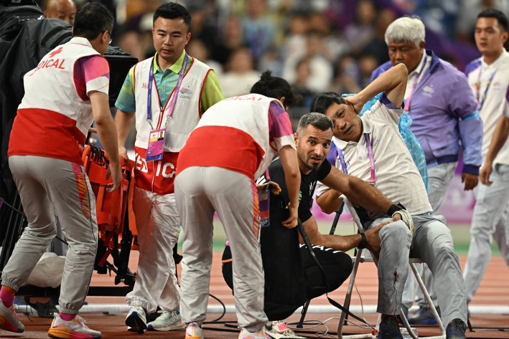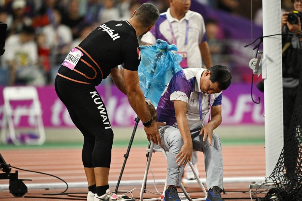 أصيب أحد الحكام بكسر في ساقه إثر رمية خاطئة من لاعب منتخب الكويت لألعاب القوى علي الزنكوي ضمن منافسات مسابقة رمي المطرقة في دورة الألعاب الآسيوية المقامة في هانغتشو الصينية.