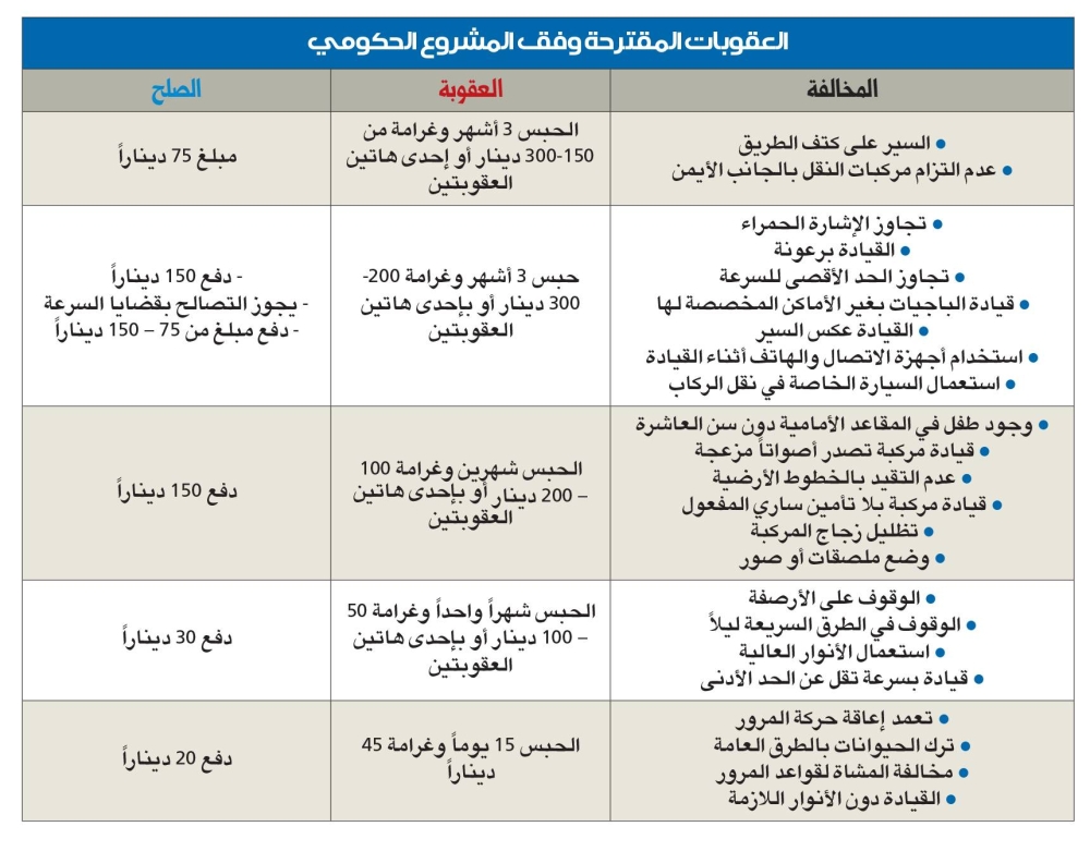 انتهت لجنة الداخلية والدفاع الى التوافق مع وزارة الداخلية بشأن تعديل قانون المرور الجديد بتغليظ العقوبات والغرامات المالية على المخالفات المرورية، خاصة الجسيمة منها، مثل تجاوز الإشارة الضوئية الحمراء والسرعة فوق المعدل وقيادة المركبة تحت تأثير المخدرات والاستهتار والرعونة والتسابق على الطريق.