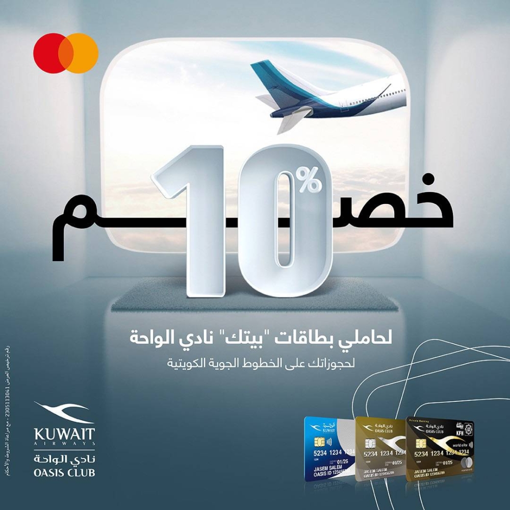 كما يحصل العملاء على خصم%10 على تذاكر باقات العطلات من الخطوط الجوية الكويتية للعطلات، وزيادة على ما سبق فإن الحجوزات تساهم في مضاعفة رصيد العميل من الأميال في نادي الواحة مقابل كل 1 دينار، عند الحجز عن طريق Booking من خلال الرابط التالي: booking.com/oasisclubku، لأعضاء نادي الواحة حاملي بطاقات بيتك نادي الواحة «الائتمانية ومسبقة الدفع»، علماً أن الخصم ينطبق على جميع درجات السفر والرحلات التي تشغلها الخطوط الكويتية.
