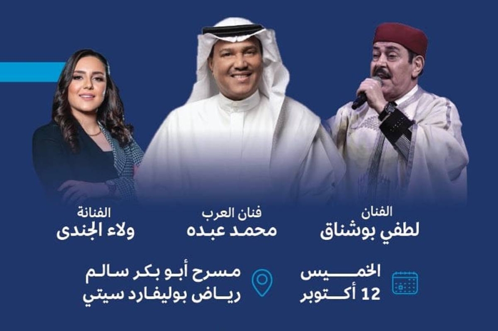 وتأتي أولى الحفلات الخميس 12 الجاري، ويشارك فيها الفنان محمد عبده، ولطفي بوشناق، وولاء الجندي، أما الحفلة الثانية فستكون يوم الجمعة 13 منه، ويشارك فيها الفنان كاظم الساهر وجاهدة وهبة وأروى السعودية.