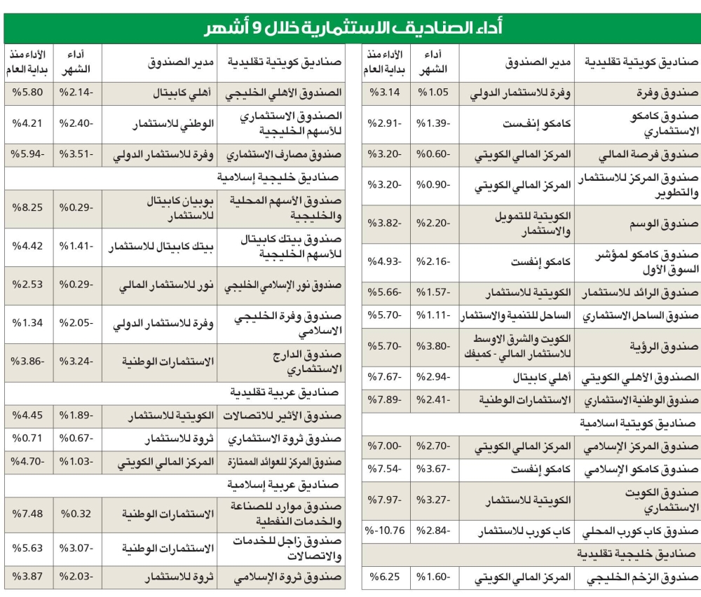 سجل 14 صندوقاً محلياً ما بين تقليدي وإسلامي خسائر عن فترة الأشهر التسعة الأولى من العام الحالي تراوحت بين 2.9% و10.7%.