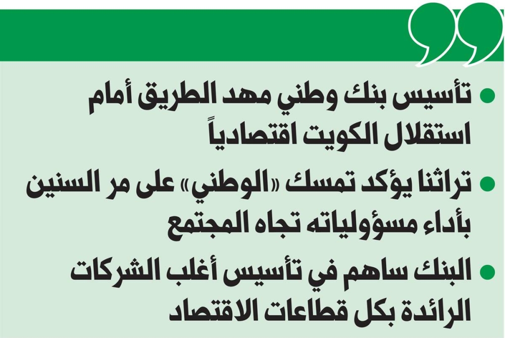 وأضاف الصقر أن «تأسيس «الوطني» قبل سبعة عقود كان بمنزلة محطة فارقة في تاريخ الكويت، وبدء الاستقلال الاقتصادي الذي مهد فيما بعد لاستقلال البلاد»، مؤكداً أن البنك دائماً كان شريكاً فاعلاً وحاضراً بقوة في عصر النمو والازدهار بعد تصدير النفط، إذ ساهم في تأسيس الشركات الوطنية الرائدة بكل قطاعات الاقتصاد، وقدم التمويل اللازم لإطلاق المشاريع التنموية والبنية التحتية.قصة تأسيس «الوطني» على يد رجالات الكويت الأخيار تبث فينا روح العزيمة والمسؤولية
