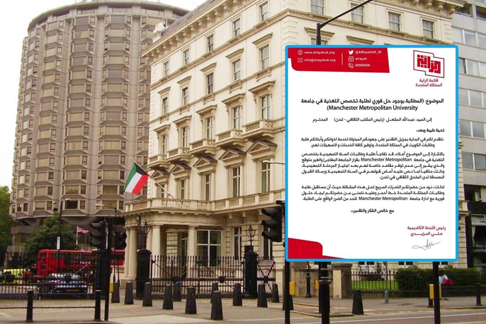 طالب رئيس اللجنة الأكاديمية في قائمة الراية علي المزيدي، المكتب الثقافي في لندن حل مشكلة الطلبة الكويتيين المبتعثين في تخصص التغذية بجامعة «مانشستر متروبوليتان» وذلك بعد اجتيازهم السنة التمهيدية وتفاجؤوا بعدم وجود مقاعد لهم في الجامعة.