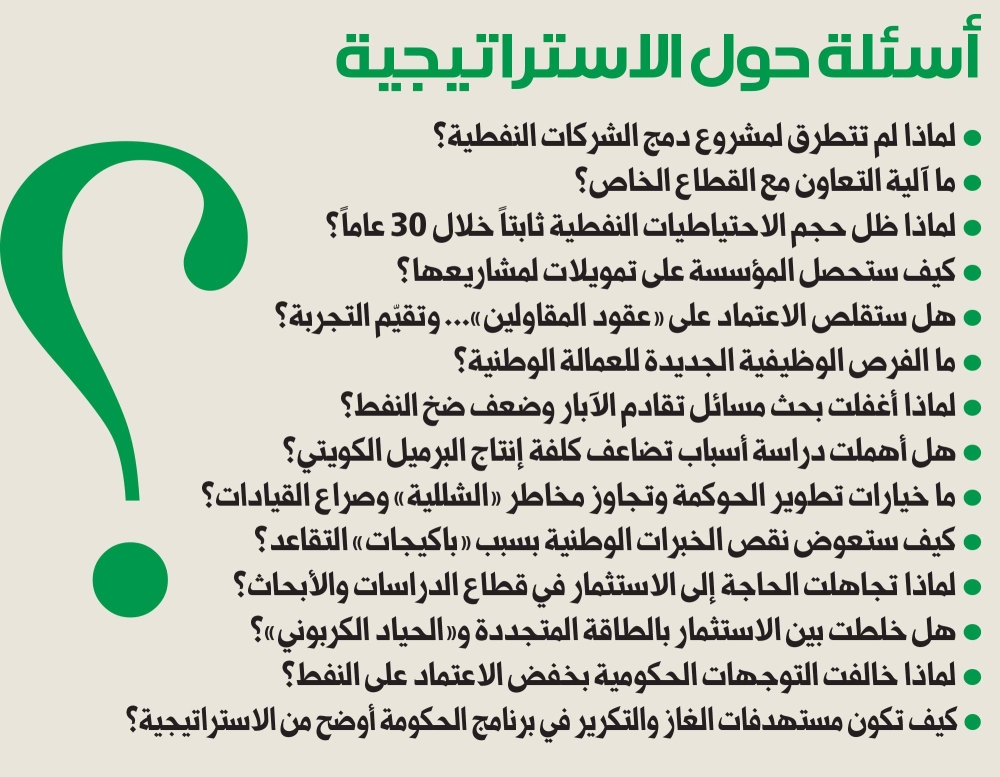 أما القصور في الاستراتيجية فكان مرتبطاً بمجموعة من الأسئلة التي تتعلق بالآثار التشغيلية، ناهيك عن الاقتصادية الخاصة باتجاهات المؤسسة وشركاتها التابعة، ولم يوضحها مؤتمر المؤسسة ككيفية الحصول على التمويل اللازم لمشاريعها التي تقدر قيمتها حسب الاستراتيجية بـ 410 مليارات دولار، وهل ستعمل الاستراتيجية على تقليص الاعتماد على ما يعرف بـ«عقود المقاولين»؟ وتقييم هذه العقود لناحية الكفاءة التشغيلية، ومدى قدرة المؤسسة على خلق المزيد من الفرص الوظيفية للعمالة الوطنية، ناهيك عن بحث مسائل فنية دقيقة ككيفية معالجة تقادم الآبار في الكويت، خصوصاً في حقل برقان وضعف ضخها للنفط الخام، ومناقشة أسباب تضاعف تكاليف الإنتاج آخر 10 سنوات وصولاً إلى 8 دولارات للبرميل بما يشكل3.97 مليارات دينار حسب بيانات الميزانية العامة للدولة، إن كانت بسبب ارتفاع مصروفات المشاريع أم نتيجة لارتفاع تكاليف الرواتب والأجور في المؤسسة وشركاتها.
