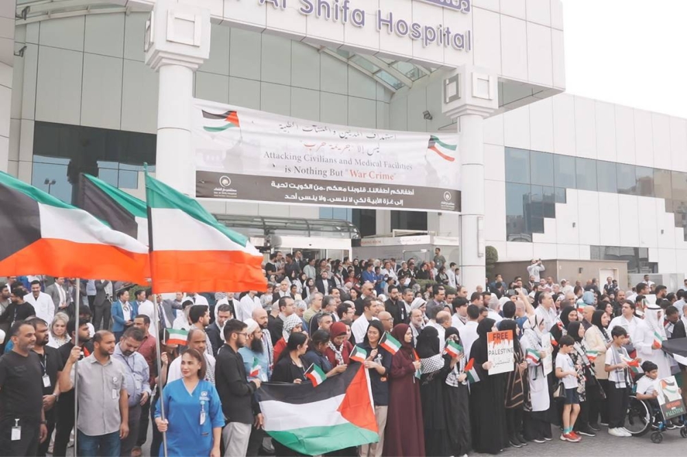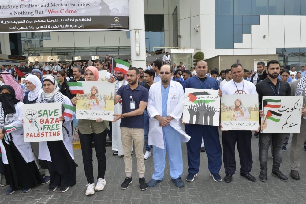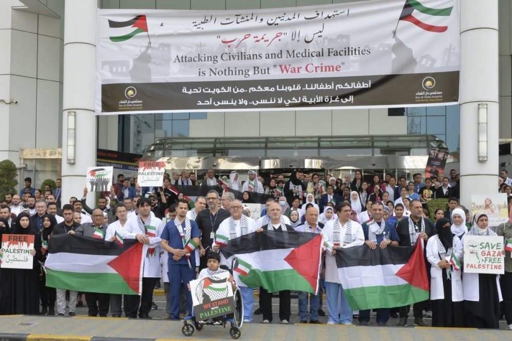 ومن جانبه، أوضح استشاري أمراض الباطنية والكلى في مستشفى دار الشفاء الدكتور محمد العازمي أن الوقفة التضامنية تعد امتداداً لموقف أهل الكويت جميعاً، حكومة وشعباً ضد جرائم الكيان الصهيوني التي لا تتوقف وخاصة على الأطفال والنساء والهيئات الطبية والتي كان أفظعها استشهاد 500 مدني في المستشفى المعمداني.