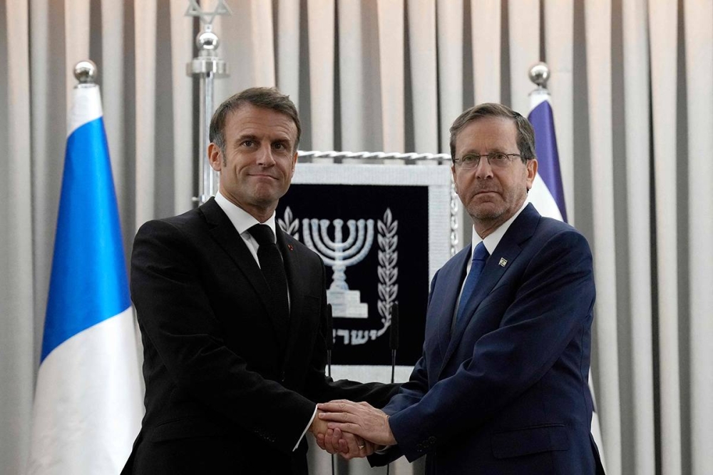 وبعدما التقى عائلات القتلى والجرحى الفرنسيين في مطار تل أبيب، قال ماكرون للرئيس الإسرائيلي إسحق هرتسوغ في القدس إن فرنسا تقف «كتفا بكتف» مع إسرائيل وإن الهدف الأول يجب أن يكون تحرير المحتجزين في غزة.