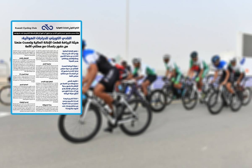 أصدر النادي الكويتي للدراجات الهوائية اليوم الثلاثاء حمّل فيه الهيئة العامة الرياضة مسؤولية قطع الإعانة المالية دون مسوغ، وتعمد منع ممثليه من حضور جلسات مع لجنة شؤون الشباب والرياضة البرلمانية.